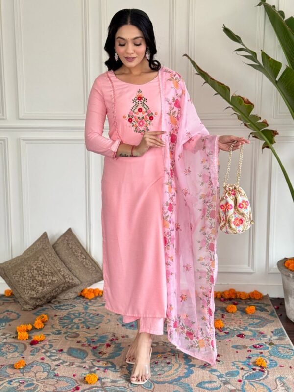 New Catalog Launched🔥 Women's Pink Cotton Embroidered and Printed Straight Kurta with Cotton Pant And Linen Cotton Laced Dupatta Sets