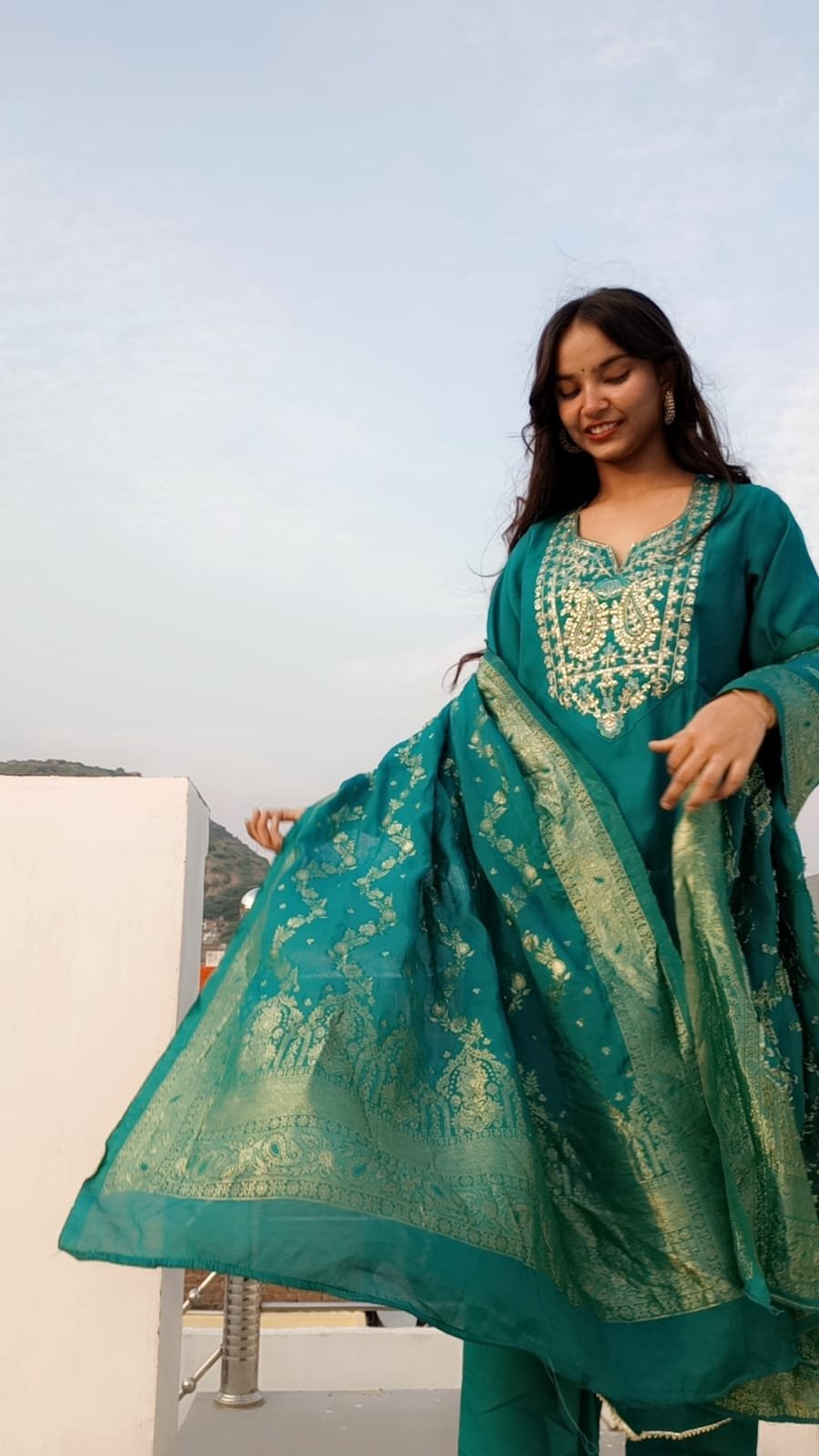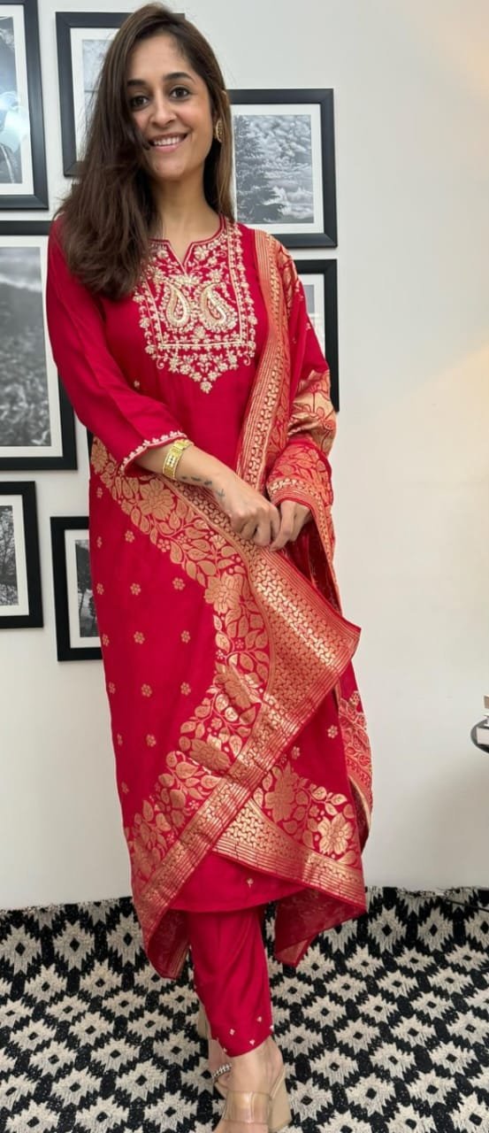 *Flaunt the amazing Red colour of this suit in your upcoming festivities. The divine and luxurious fabric with weaving zari gives it elegant look. It is decorated sequance work and premium Embroidery works on nack 🌿*