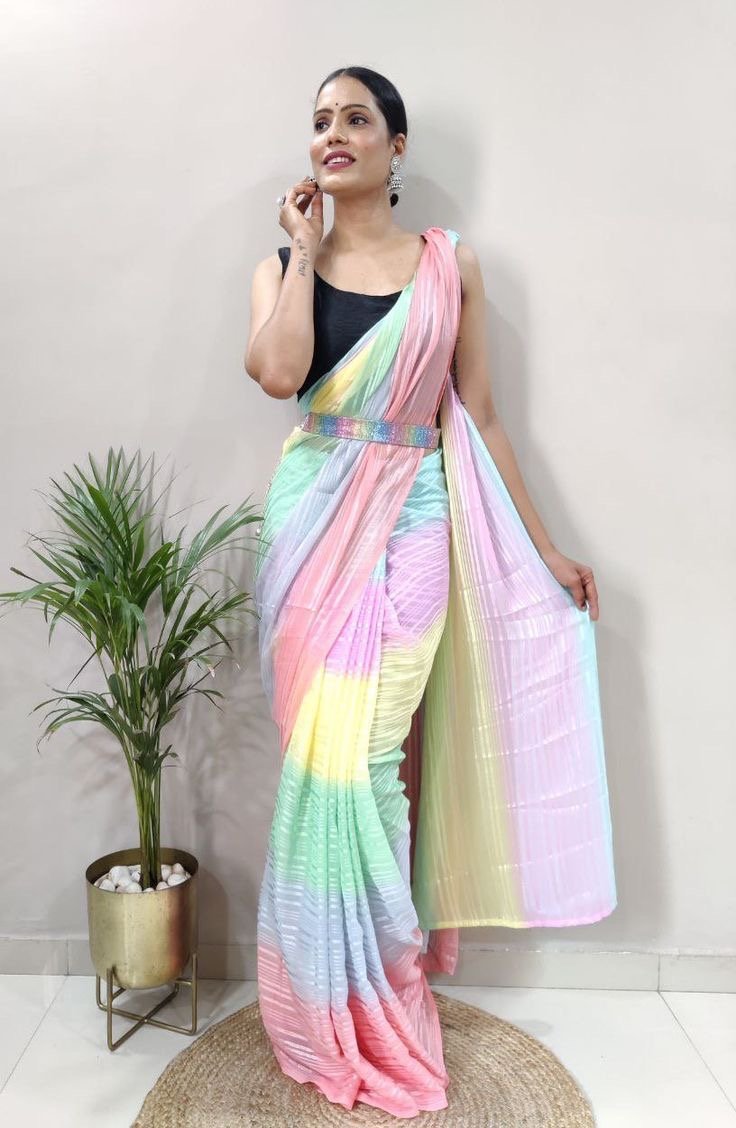 *Fabric details – chiffon aastha jari all over rainbow tone colour shade saree*