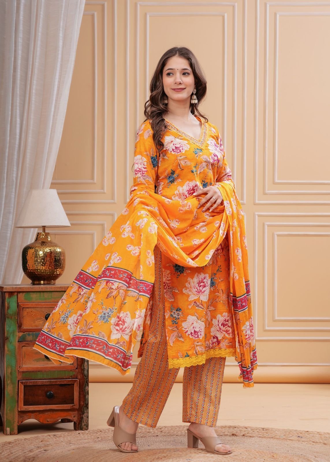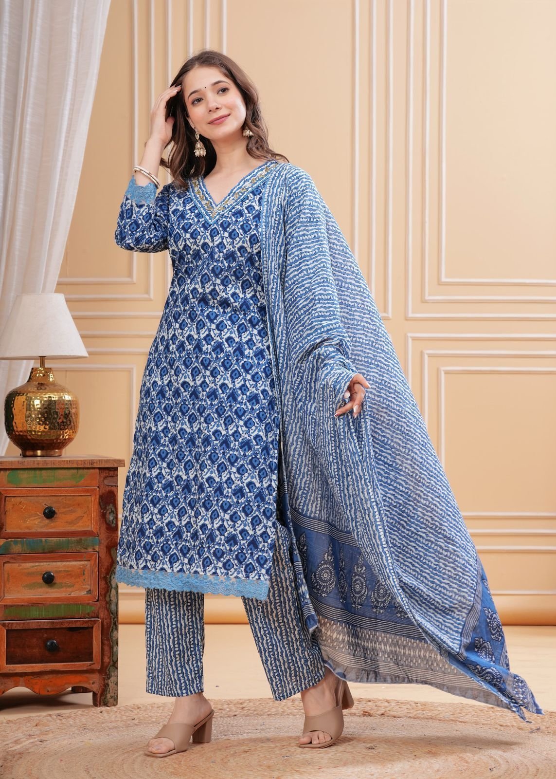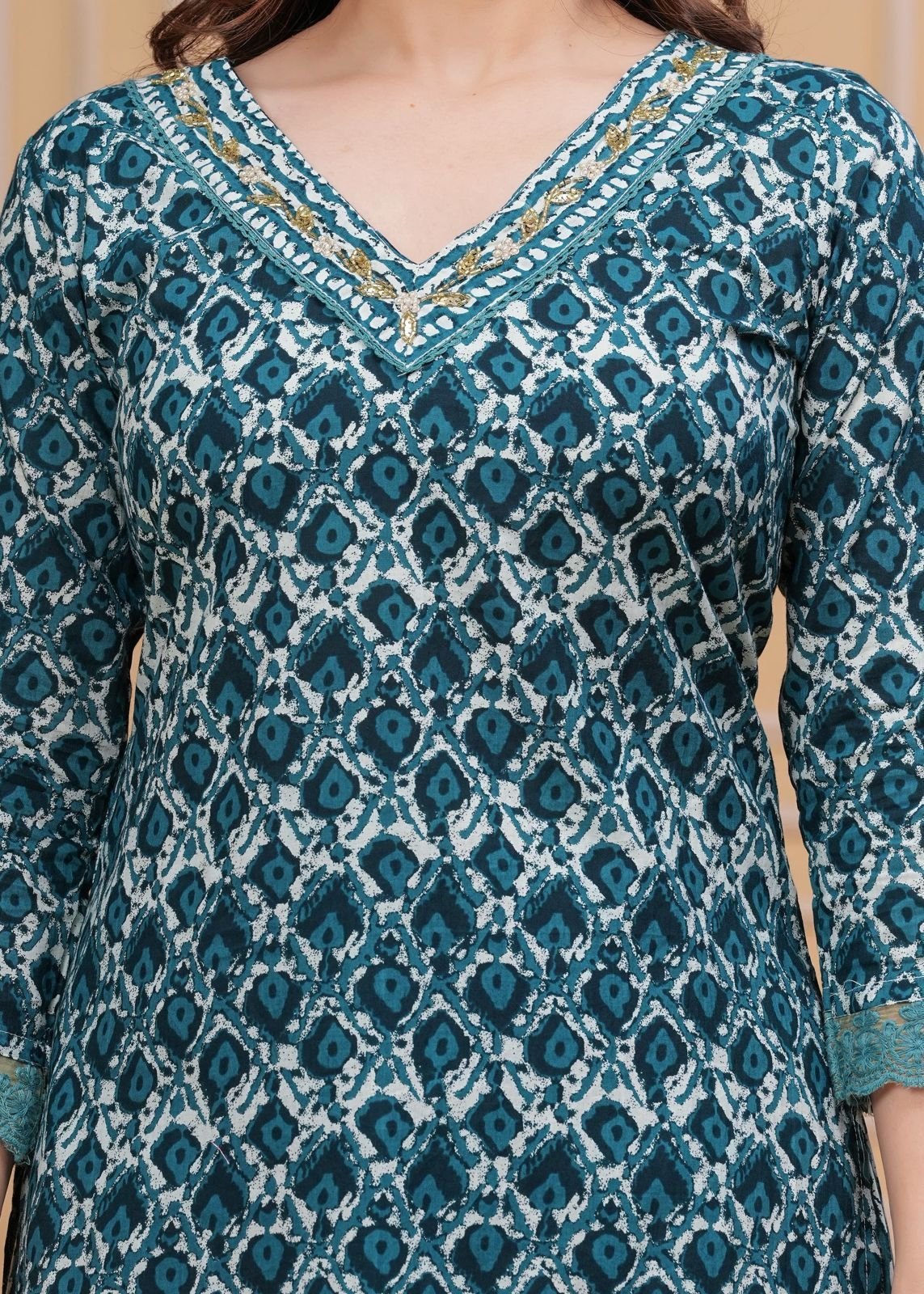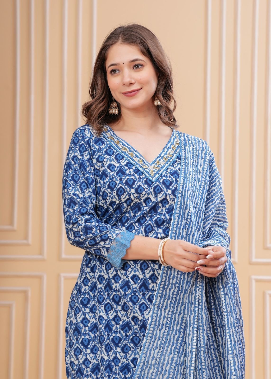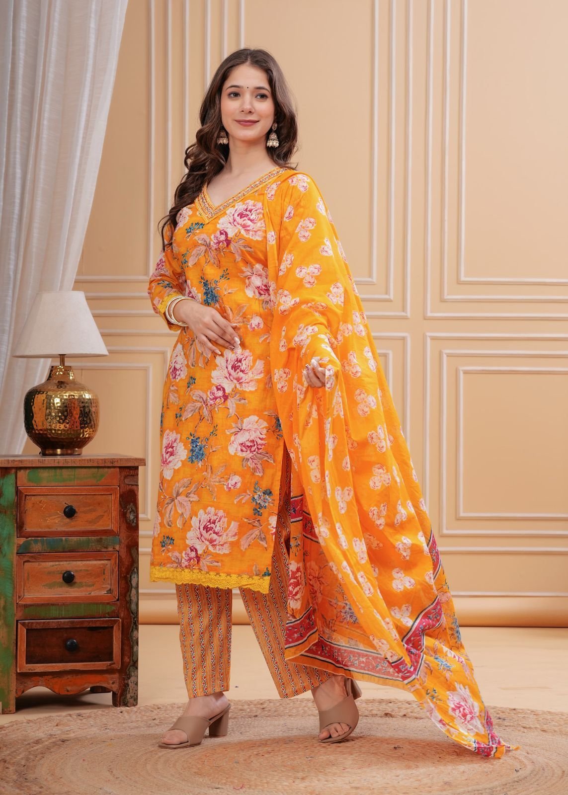 *⭐️Cotton Printed Kurti with Pant and malmal dupatta with beautiful hand work on yoke⭐️*