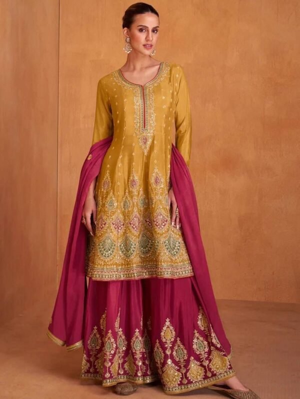 Dual Tone Strip Chinon Heavy Embroidered Stitched Sharara Suit Set With Dupatta