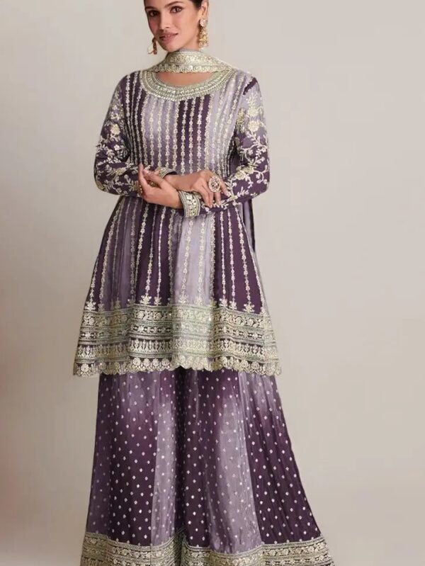 This Women's Purple Chinon Stitched Top with Stitched Bottom Embroidered Flared Kurta (Kurta Palazzo Set) is a stunning outfit. Here are the key details: