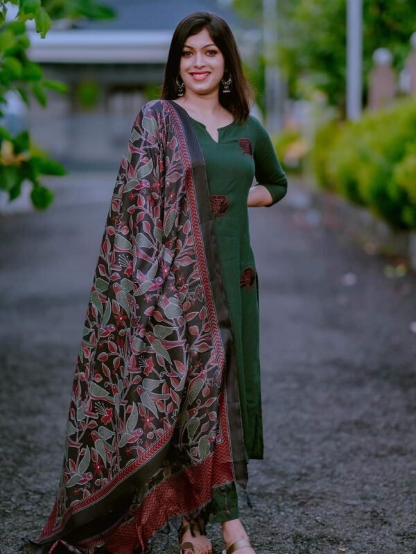 Bloom in our bottle green khadi set with embroidered rose 🌹paird with kantha silk dupatta is a stunner✨*