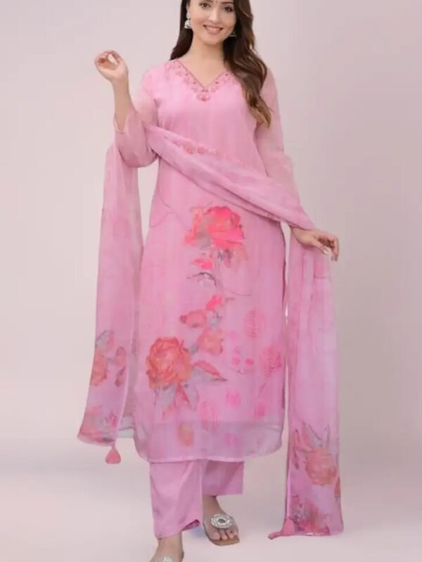 ProductThis women's off-white organza embroidered and printed straight kurta with viscose rayon pant and organza printed dupatta set seems like a great option for various occasions.