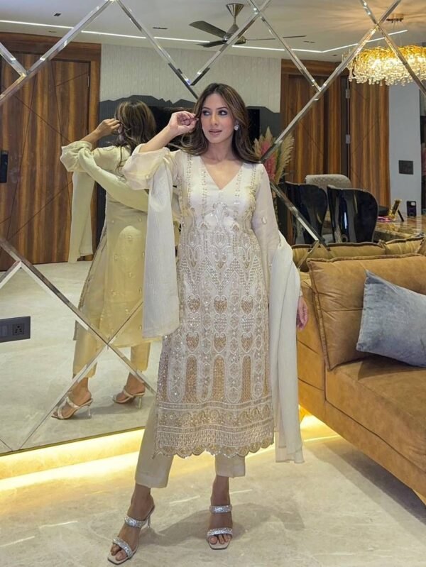 DESIRABLE FANCY FAUX GEORGETTE SEQUENCE EMBROIDERED WORK TOP AND PENT WITH DUPATTA*